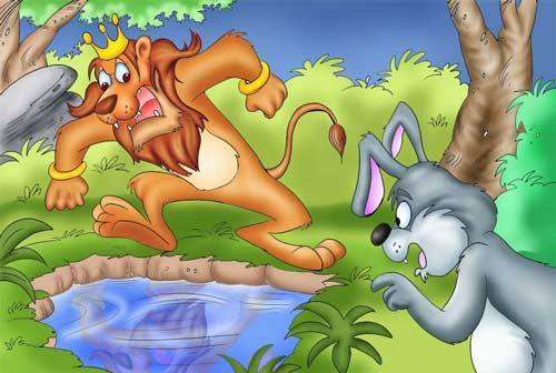 وذات يوم وقع الاختيار علي ارنب صغير ليكون هو الوجبة التي سوف يتم تقديمها الي الاسد، كان الارنب بالتأكيد لا يريد الموت ولكنه كان مرضاً ان يذهب الي عرين الاسد، وخلال طريقه رأي بئر ماء وعندما نظر بداخله وجد انعكاس صورته، فخطرت علي باله حيلة ذكية للتخلص من الاسد والنجاة بحياته .