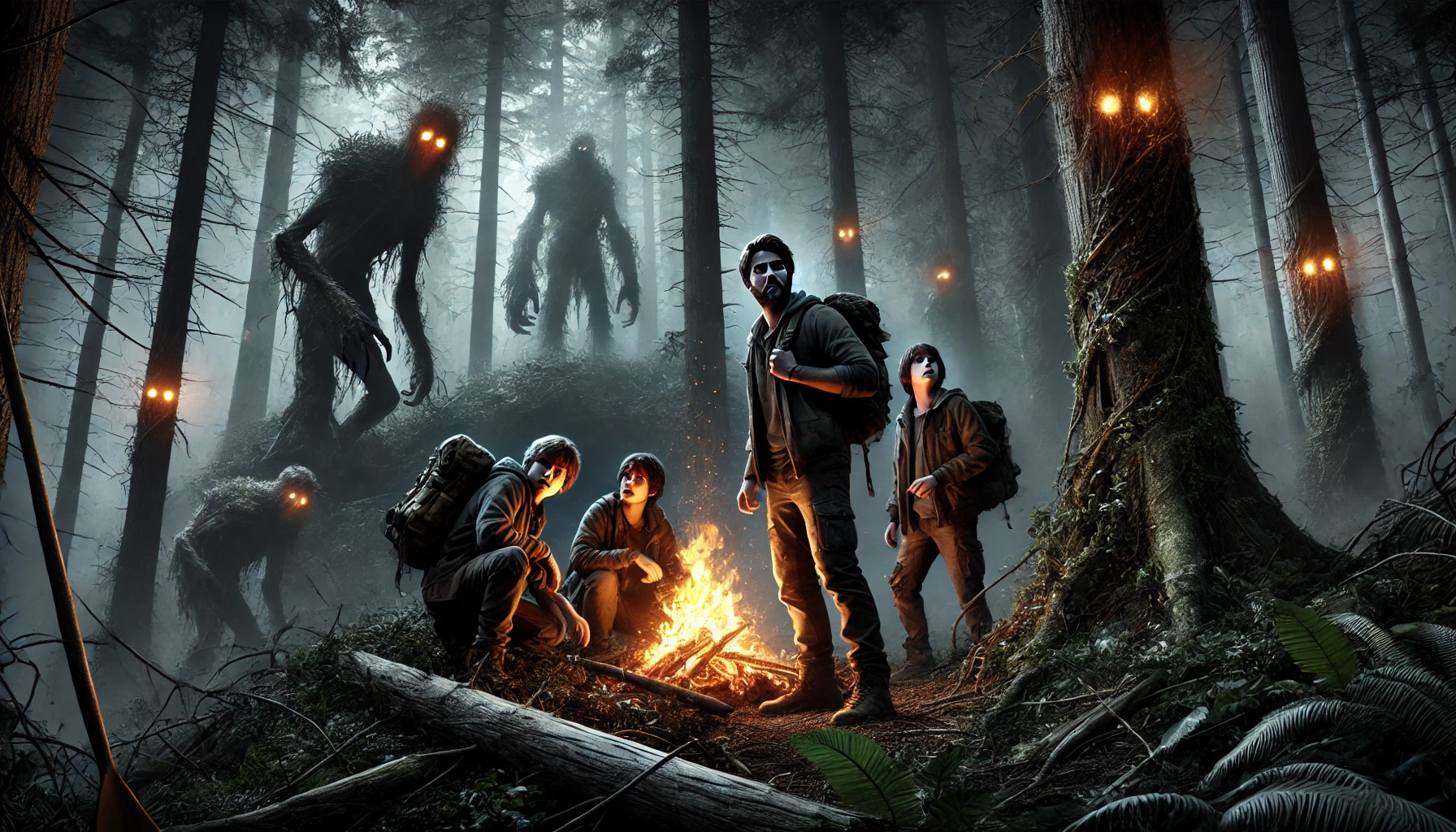 في إحدى الليالي، وبينما كانوا يناقشون خطط الهروب، ظهر فجأة شخص غريب بين الأشجار. كان هزيلاً، بملابس ممزقة، وعيناه مليئتان بالرعب. “ابتعدوا عن الظلام… إنه يطاردكم…” ثم اختفى كما ظهر.