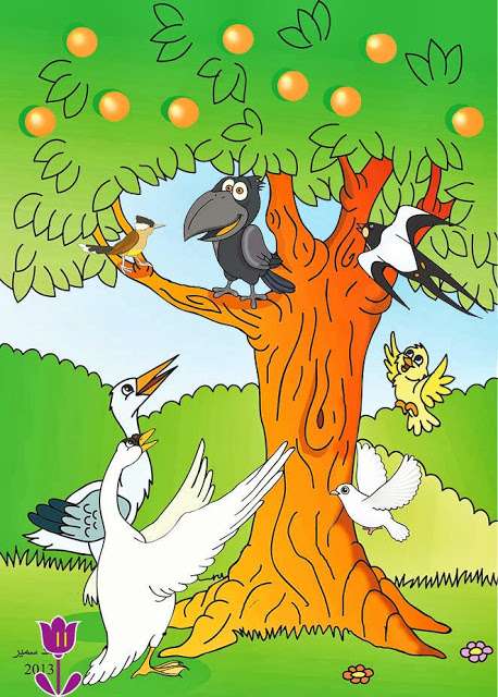 خجل الغراب وطار مبتعداً عن المكان فقد عرف ان الجميع لا يحبون صوته، وفي كل صباح من مكانه البعيد كان يسمع تغريد البلبل لكنه لا يستطيع ان يقول شيئاً .