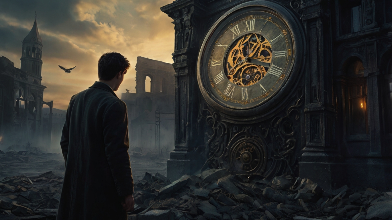في رعب، أعاد عقرب الساعة إلى مكانه، فعاد كل شيء للحركة كأن شيئًا لم يكن. عندها أدرك أن الساعة ليست مجرد أداة… بل قلب الزمن نفسه.