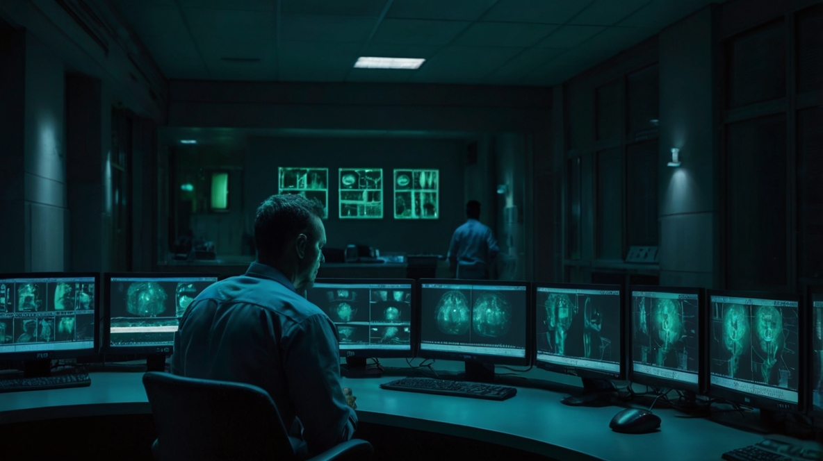 كان يعمل حارسا ليليا في مبنى إداري شبه مهجور، وظيفة مملة تعتمد على الجلوس أمام شاشة تعرض بث كاميرات المراقبة. ممرات فارغة. مكاتب مغلقة. أضواء فلوريسنت باردة لا حياة فيها.