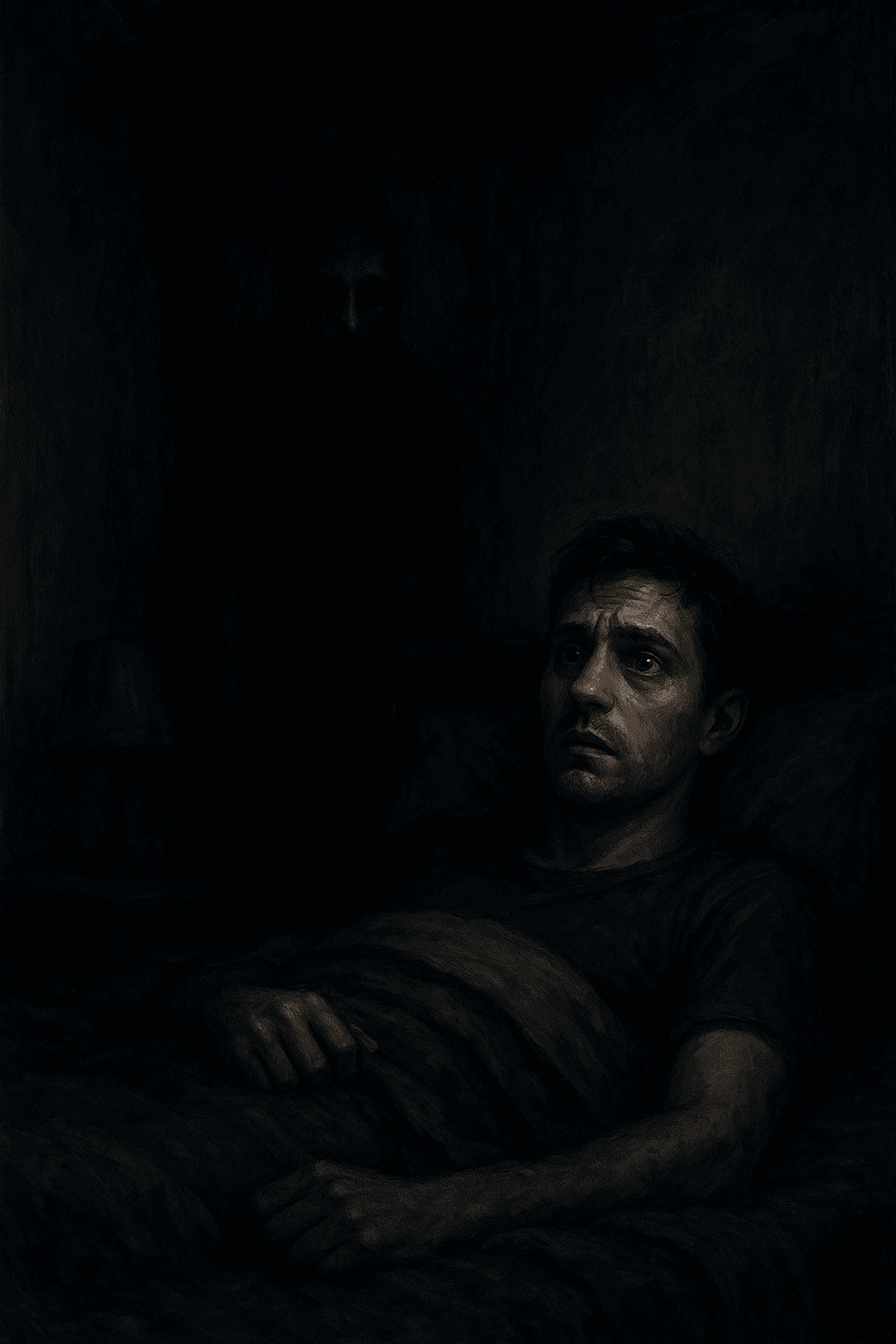 في الليلة التالية، رأى شيئاً أكثر رعباً: وجه باهت يظهر في الزاوية، عيناه سوداوين عميقتين تحدقان فيه بلا رحمة. حاول الصراخ، لكن صوته اختفى في الهواء، وكأن الغرفة ابتلعته. كل حركة قام بها كانت ثقيلة، وكل نفس يصبح أصعب من السابق.