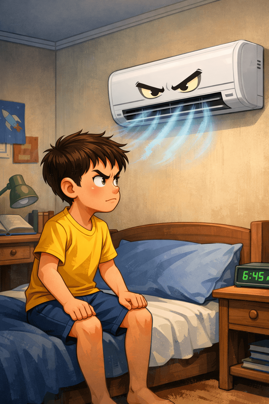 في المساء، قرر سامر النوم. قال للمكيف: الآن وقت النوم، كن لطيفًا. أطفأ النور واستلقى. بعد دقائق شعر بالبرد. لف نفسه بالغطاء وهمس: حسنًا، فهمت الرسالة.