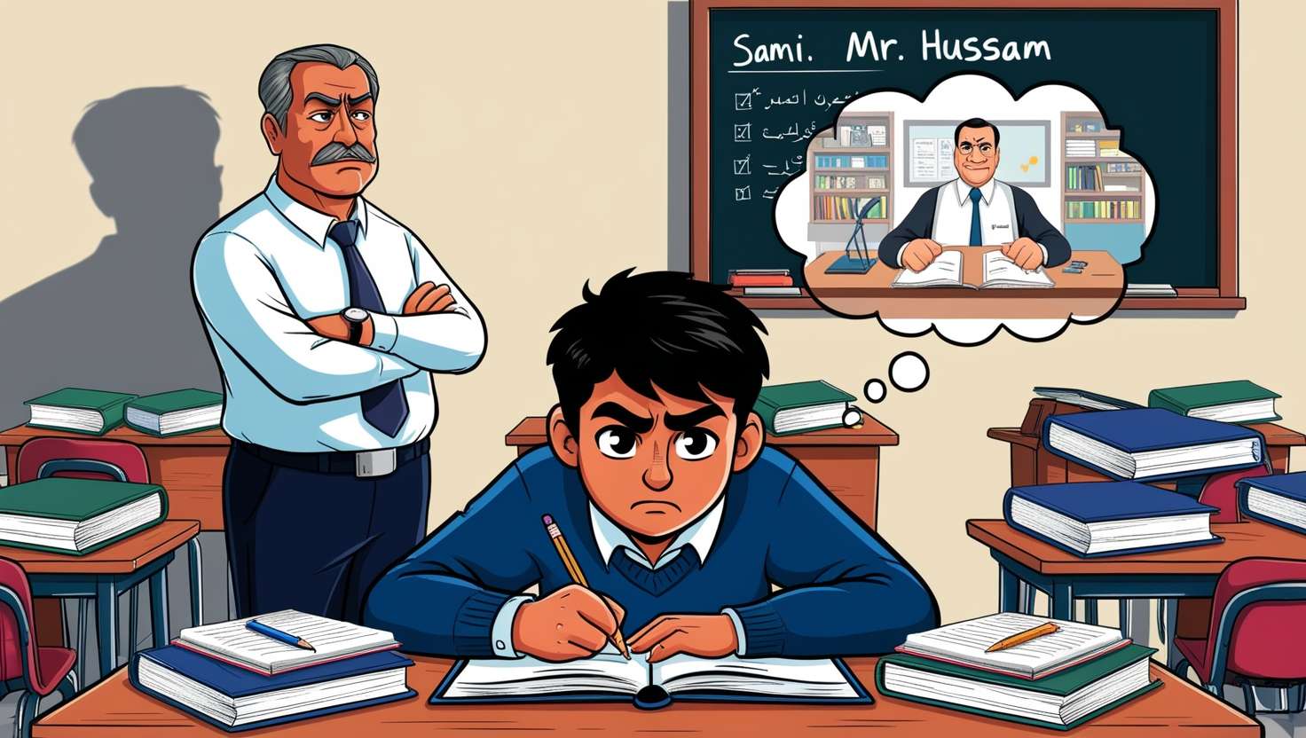 في أحد أحياء المدينة الصغيرة، كان هناك طالب يُدعى سامي. كان سامي طالباً متفوقاً ولكنه كان يواجه صعوبة في التأقلم مع معلمه في مادة الرياضيات، الأستاذ حسام. كان الأستاذ حسام معروفاً بأسلوبه القاسي وسخريته من الطلاب الذين لا يحققون النتائج المثالية. وكان سامي من بين هؤلاء الطلاب الذين سخر منهم الأستاذ حسام بانتظام، مما أثر بشكل كبير على ثقة سامي بنفسه.