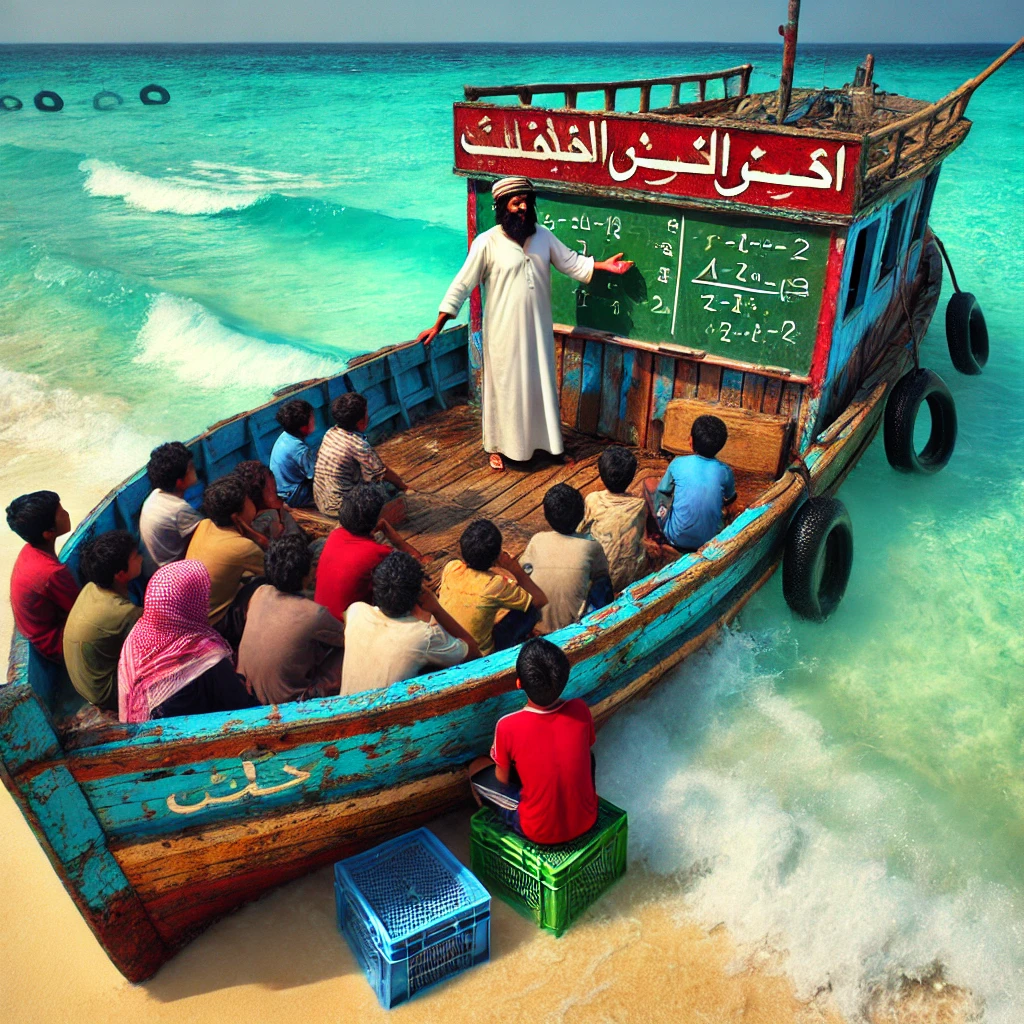 فكَّك مراد شباك الصيد القديمة، وثبتها على ظهر المركب لصنع سقف. جمع ألواحًا خشبية من حطام السفن لصنع مقاعد. أول سبورة له كانت غطاءً أسود لبرميل ماء مكتوبًا عليه بالطباشير: “اليوم سنتعلم كيف تقيسون عمق البحر دون أن تبللوا أقدامكم!”.