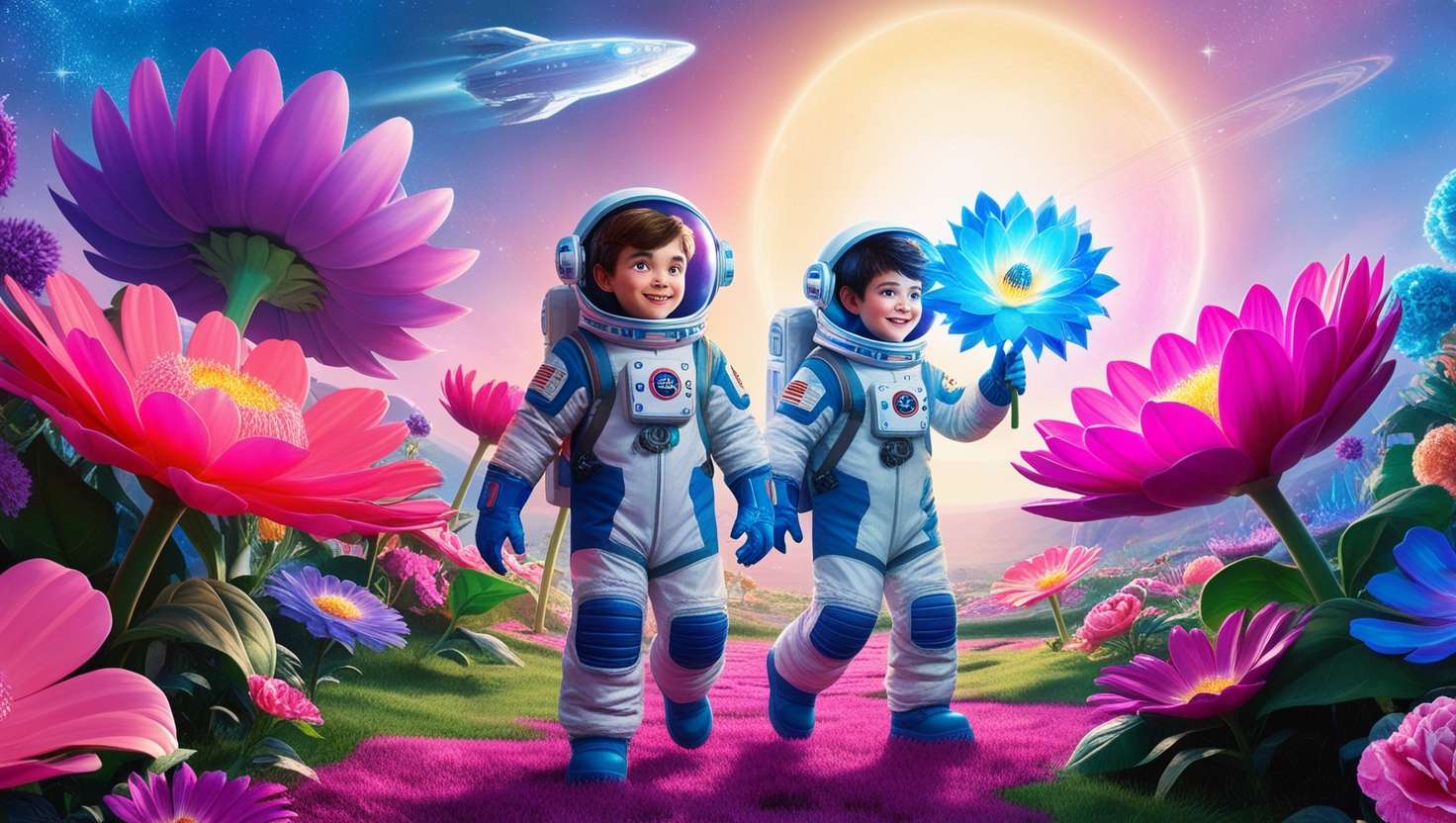 المركبة بدأت تتحرك، وظهر على الشاشة خريطة كوكب زهور بعيد. هبطا على هذا الكوكب المدهش، حيث كانت الزهور العملاقة تتفتح بألوان زاهية، والأشجار الوردية تطلق عطرًا ساحرًا، والحيوانات الصغيرة ذات الأجنحة الشفافة تتراقص في الهواء.