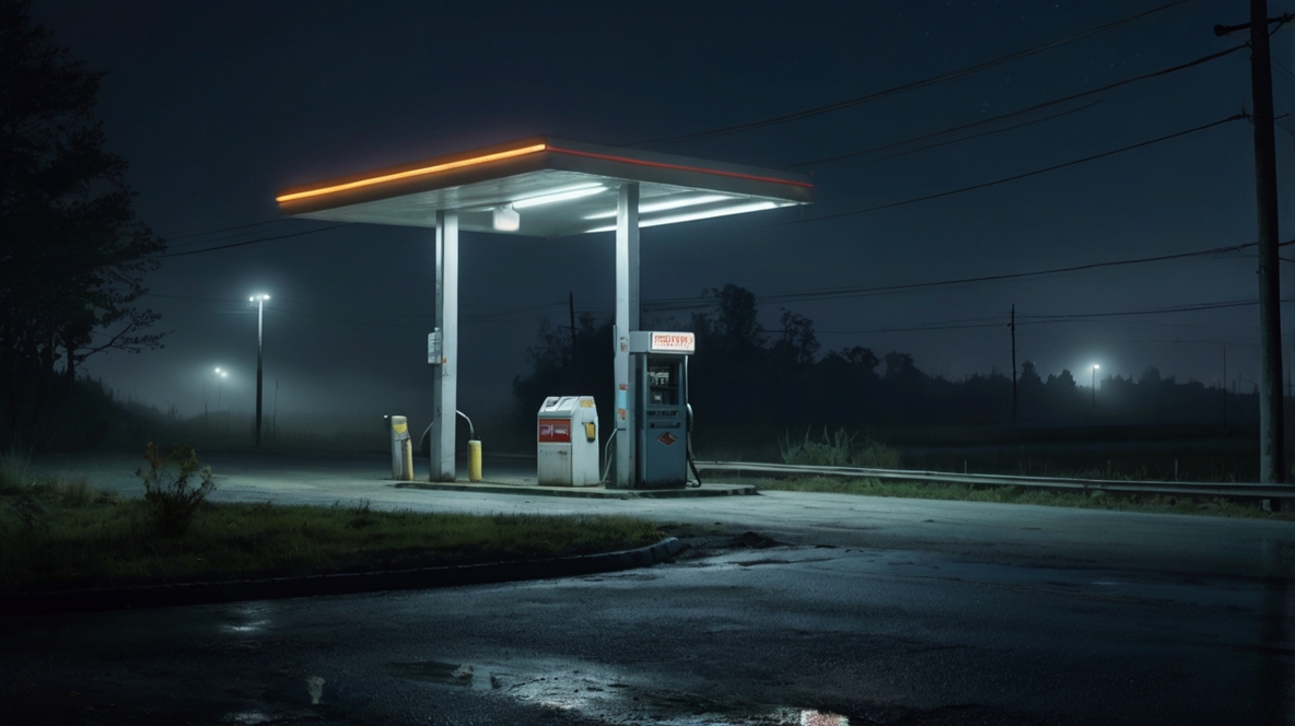 بعد دقائق بدأ يرى محطة وقود قديمة. شكلها يوحي بأنها مهجورة منذ سنوات طويلة. الأنوار مطفأة. الواجهات مكسوة بالغبار. ومع ذلك كان باب المتجر الداخلي مفتوحا قليلا. توقفت سيارته وحدها دون أن يضغط على المكابح.